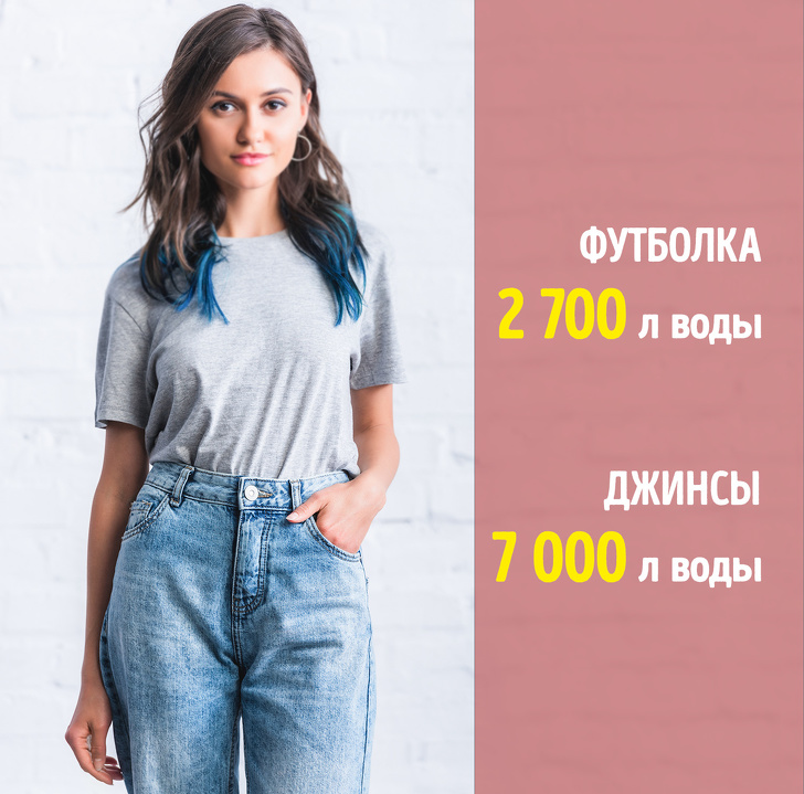 Здавалося б, що поганого в тому, щоб купити зайву футболку? А те, що на її виробництво йде 2 700 л води (стільки споживає середній людина за 900 днів). На пару джинсів — 7 000 л. І це без урахування шкідливих відходів і хімікатів для фарбування. Добре, якщо будуть носити футболку, а не відразу відправлять на смітник, як і багато предмети «швидкої» моди. Наприклад, у Гонконзі кожну хвилину викидається 1 400 футболок.
