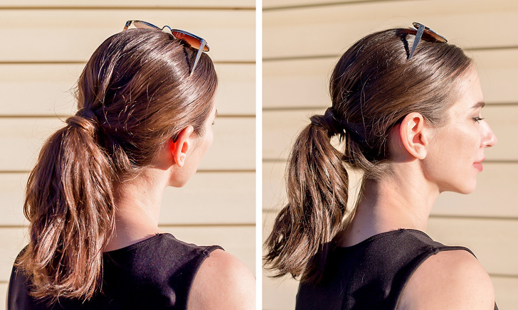 З вчорашнього дня в мене ще видно залишки кучерів, і я вирішила це використовувати. Зробила начіс біля коріння, щоб заховати більш помітну частину невымытых волосся, і зав'язала низький хвостик. Цю нехитру конструкцію зафіксувала лаком і прикрила коріння сонячними окулярами — все це допомогло приховати, що голова вже не першої свіжості. Вигляд у мене вийшов дуже діловий, і я продуктивно працювала, а ввечері у мене була запланована сімейна зустріч, і я була до неї більш ніж готова.