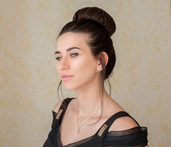 Після вчорашньої косички у мене залишилися легкі хвилі. І я вирішила, що найкращий варіант на сьогодні — злегка начесать волосся біля коріння, щоб вийшов додатковий обсяг, а потім закрутити їх у мушлю. До речі, якщо у вас дійсно брудна голова, як у мене, і немає часу її помити, то зробіть акцент на червоні губи. Це відволікає увагу від зачіски. У мене було саме так.