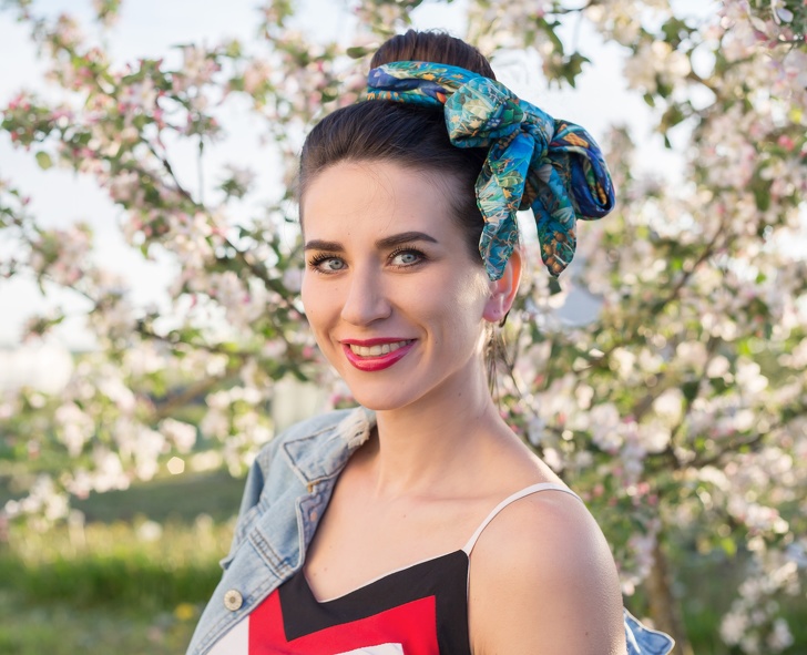 У сонячний день гріх не піти на прогулянку. Саме цим я і займуся сьогодні. Для маскування своїх жирних від коренів до кінчиків волосся мені потрібна важка артилерія — хустку. Я вибрала дуже яскравий, щоб він притягував погляди. Зачіски з хусткою добре виглядають і на зібраних, і на розпущених локонах. Свої я зібрала в пучок і закріпила невидимками.