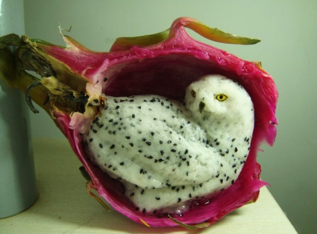 Сова, вирізана з драконячого фрукта.