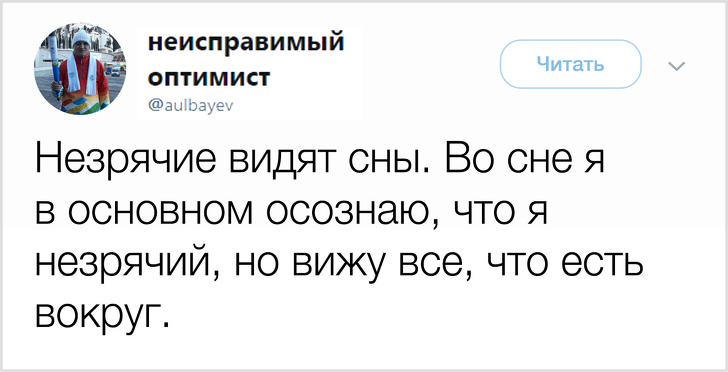 - Незрячі бачать сни. У снах я в основному усвідомлюю, що я незрячий, але я бачу все, що є навколо.