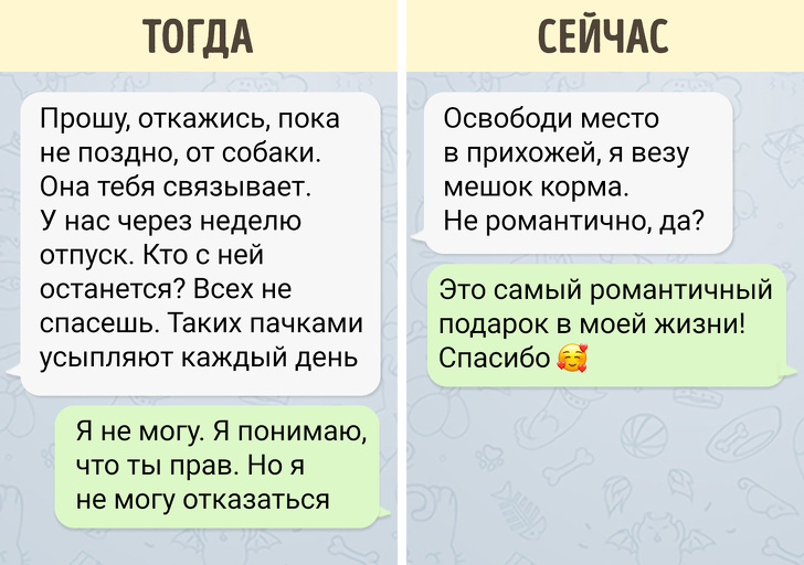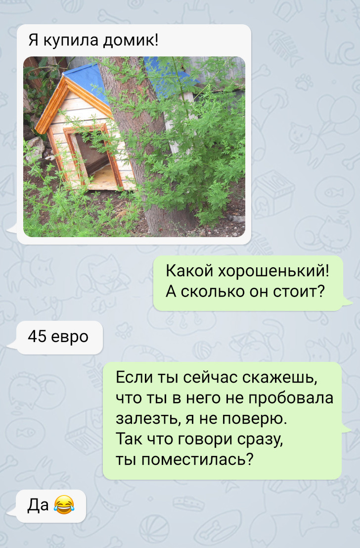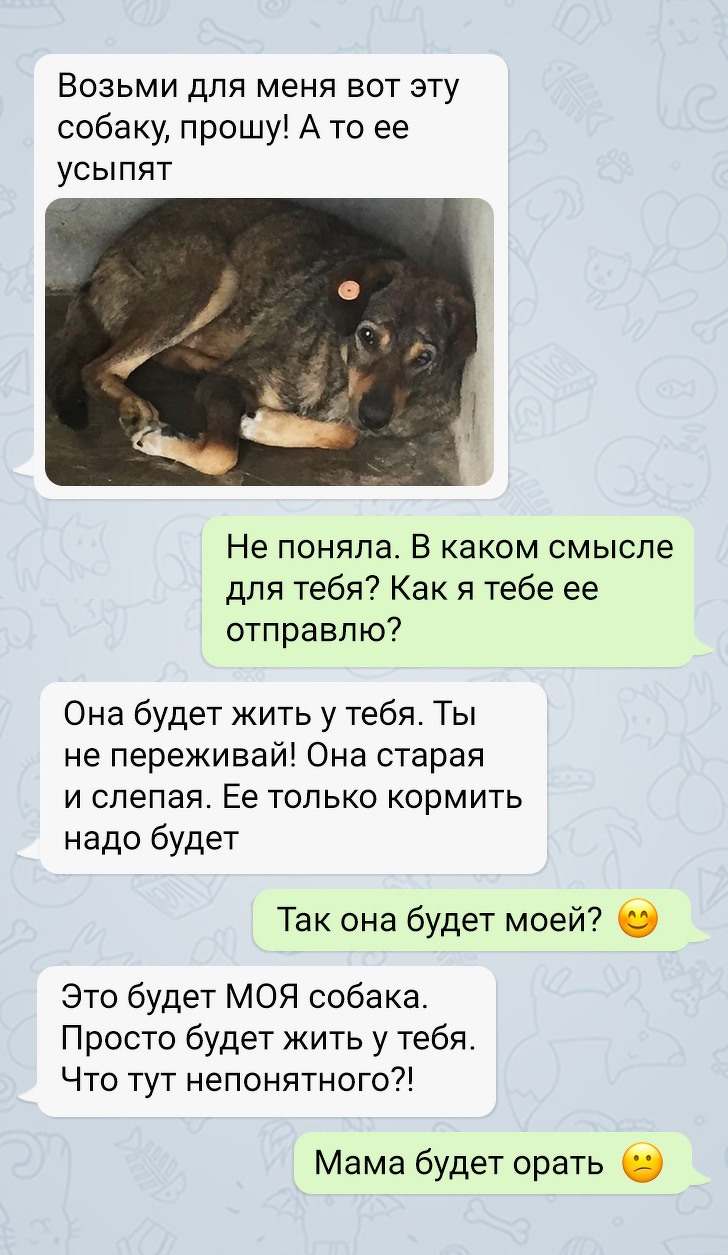 Це листування з моєю молодшою сестрою, яка живе на іншому континенті. Відчуваєте розбіжність між словами «візьми для мене цю собаку» та місцем проживання? Ось і я її відчула відразу. Ясна річ, що собака буде цілком і повністю на мені. Але дитина в мені, який в дитинстві дуже хотів собаку, почув дитини в моїй сестрі, який все ще хоче собаку. Я намагалася не згадувати про те, що після моїх поїздок з дому живими мене чекають тільки кактуси і мох в банку. Я здалася. Написала куратора, який займався влаштуванням тварини, що хочу «усобачерить». І стала готуватися стати щасливим власником пса.