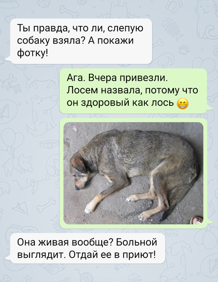 Перші добу після приїзду пес тулився в куточку саду. Я носила йому їжу, вмовляла пити, боязко гладячи по голові. Коли друзі просили показати фотографію собаки і я їм відсилала це, мене питали: він хворий? Ти з глузду з'їхала! Здай його в притулок! Я відповідала, що забрала Лося з притулку не для того, щоб знову туди відправити. Він не хворий, просто сліпий і сумний. А на третій ранок, коли він вийшов мені назустріч, махаючи хвостом, я зрозуміла, що ми відмінно порозуміємося. До цього моменту я не була ні в чому не впевнена. А тепер зрозуміла, що у мене є собака. Я думала, цього ніколи не станеться.