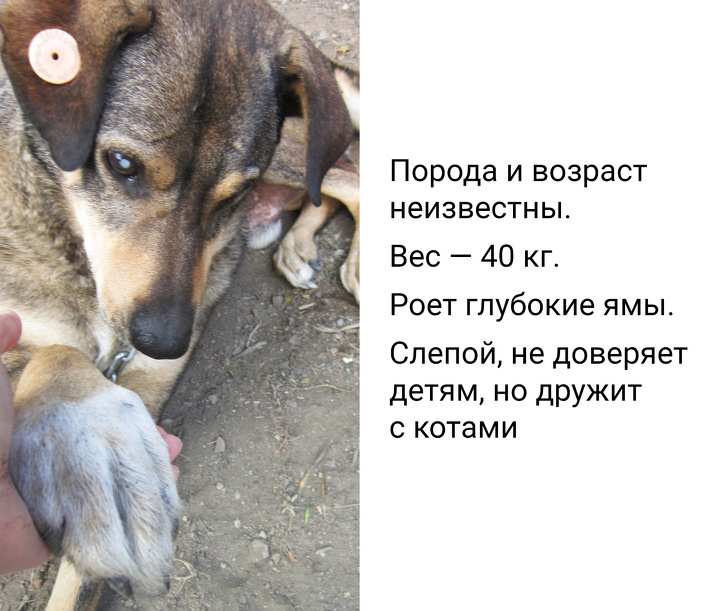 Хороший він тільки для своїх. Характер у пса опинився в точності як у мене самої, досить конфліктний. Але це пояснюється сліпотою і складним життям. Куратор розповів, що його били, в нього стріляли, а потім подзвонили в службу моніторингу тварин і попросили приспати. У муніципальному притулку він провів 2 місяці без прогулянок. Хоча це скоріше везіння. За нього боролися куратори, постійно продовжуючи термін, так як в притулках тримають лише певний час, а потім...