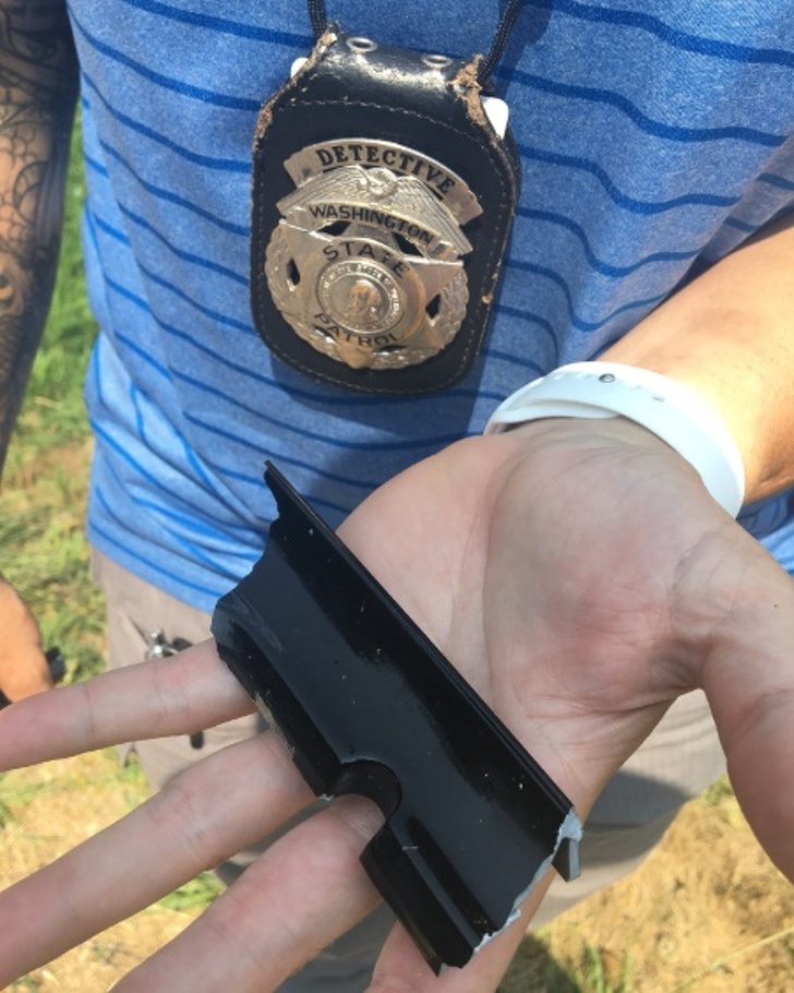 17. Осколок від автомобіля, знайдений на місці, де збили велосипедиста