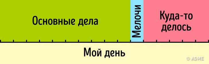 Ні, я не клацала кнопкою таймера кожен раз, заходячи у ванну або чекаючи ліфта, але намагалася визначити, скільки віднімають часу найважливіші справи, з яких і складається день: робота, прибирання, приготування їжі, сніданки-обіди-вечері, заняття з дитиною і т. п.