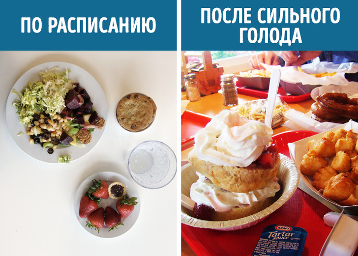 У стрімкому темпі сучасного життя ми часто забуваємо пообідати і приходимо додому страшенно голодні. І тут немає нічого простіше, ніж з'їсти що-небудь солодке, а на додачу до цього потім увесь вечір «попоїсти». Цю тягу провокує саме голод, бо тут починають працювати гормони, пов'язані з апетитом. Дотримуйтеся схеми 5-разового харчування (сніданок, обід, вечерю і перекуси між ними), і тоді такої проблеми не виникне.