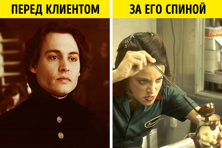 У фільмах часто-густо показують, як ображений офіціант плює в каву нахабному відвідувачу або робить щось гірше. На ділі ж я ніколи за час роботи не помічала нічого подібного. Наявність камер перетворювало подібне бажання помститися в дуже небезпечну авантюру, яка погрожувала звільненням.