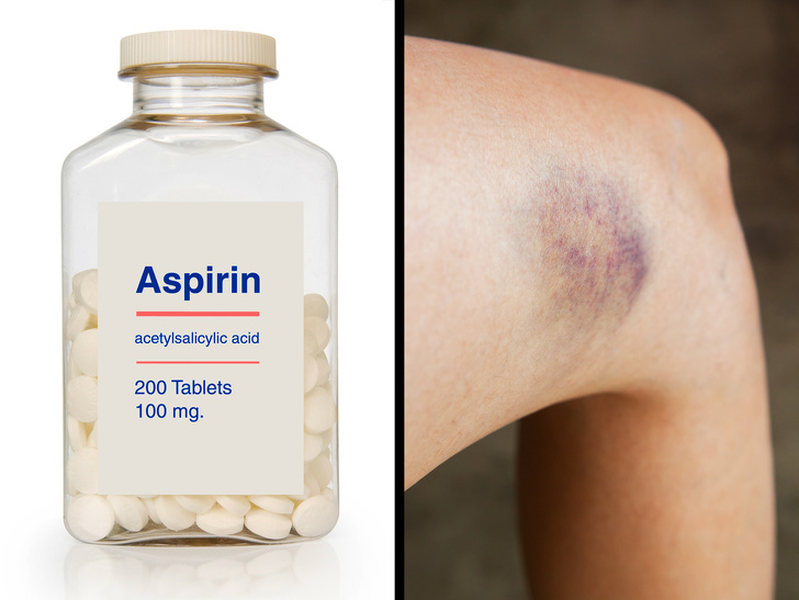 Це найпоширеніша причина появи синців на рівному місці. Аспірин, як і інші розріджують кров препарати, що запобігають процес згортання крові. При такому стані навіть мінімальна травма призведе до появи синяка.