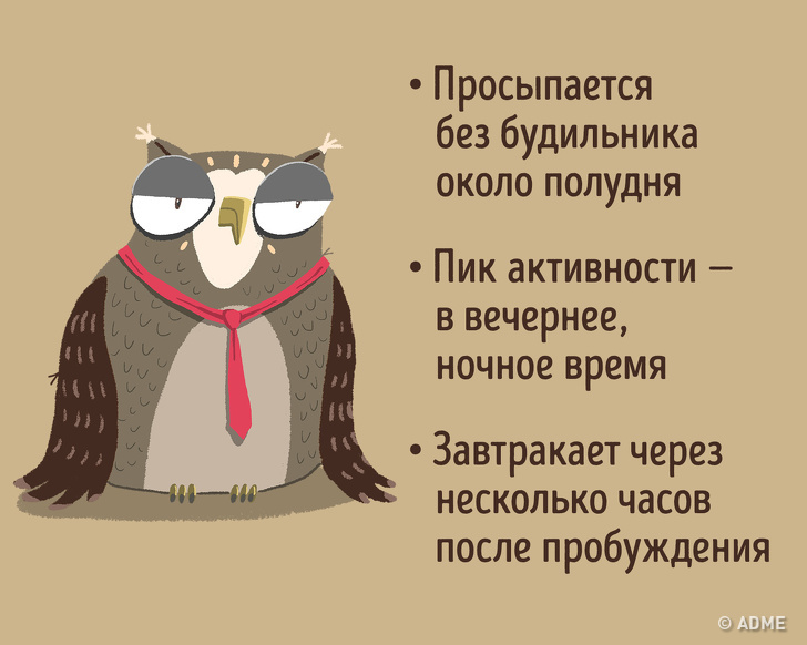 Ну і якщо правило зимового анабіозу поширюється на всіх ведмедів, то у людей все набагато складніше. Британські та американські вчені 7 років вивчали різні хронотипы і прийшли до висновку, що люди-сови частіше страждають недосипом, відчувають стрес і мають підвищений ризик передчасної смерті. І все це з-за того, що сови змушені рано вставати і підлаштовуватися під звичний для більшості режим всупереч своїм природним ритмам. Шах і мат, натуралісти.
