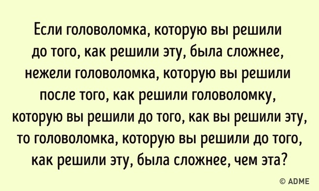 Головна складність цієї загадки — саме будова пропозиції з повторами і смисловими поворотами. Але якщо розібрати його по частинах, отримаємо зовсім просту фразу: якщо попередня загадка була складніше, ніж ця, то була попередня загадка складніше, ніж ця?