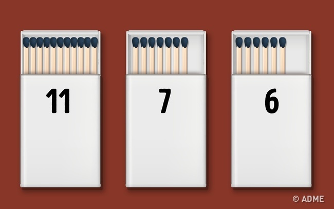 На столі 3 коробка сірників. У першому — 11 сірників, у другому — 7, а в третьому — 6. Всього за 3 рази потрібно перекласти сірники так, щоб у кожній коробці виявилося з 8 сірників. Причому щоразу в будь коробок можна додати рівно стільки сірників, скільки в ньому вже лежить.