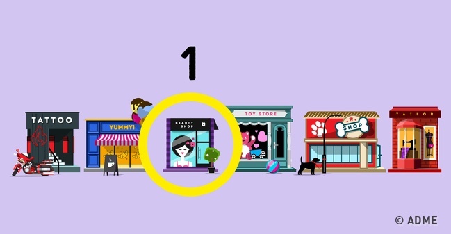 Рішення: За умовою, ательє — останній, 6-й будинок на вулиці. Ательє від кондитерської відокремлюють 3 будинки, а від салону краси — 2, значить, кондитерська знаходиться на 2-му місці, а салон краси — на 3-м. Магазин іграшок і тату-салон поділяють 2 вдома, значить, вони можуть бути тільки на 1-му або 2-му місці. Тоді на 5-му місці точно варто зоомагазин. Відомо, що магазин іграшок знаходиться між двома будинками, значить, він на 4-му місці, а тату-салон — на 1-м І будинки на вулиці стоять в такому порядку: