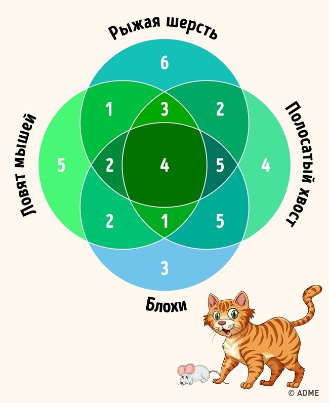 На фермі в цілому живе 20 котів з різними забарвленнями і характерними особливостями. На малюнку зображені пересічні області, в які входять всі місцеві коти, а цифрами зазначено їх кількість. Використовуючи малюнок, дізнайтеся, скільки котів відповідає кожному опису: