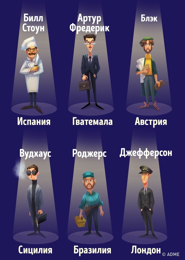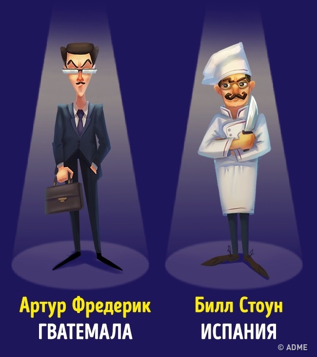 - Якщо розкласти по країнам всі варіанти відомих нам професій, ми побачимо, що для Гватемали та Іспанії підходять тільки нотаріус та кухар. Білл Стоун може бути або гватемальцем, або іспанцем. Для цих країн 2 ми знайшли всього 2 професії. І нам відомо, що нотаріус у 4-й день був помічений в іншій парі. Відповідно, Білл Стоун — кухар.