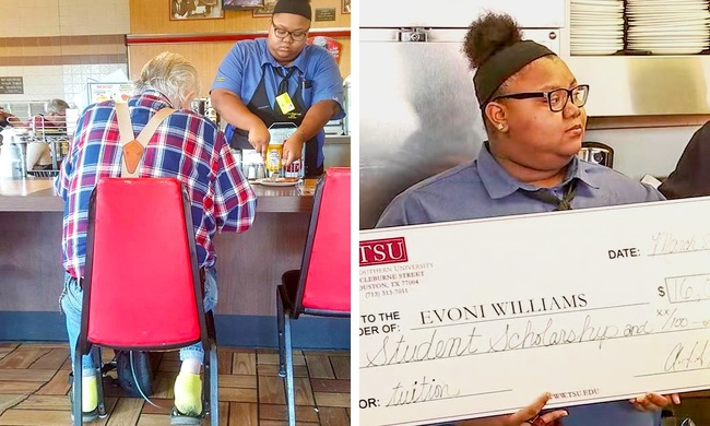 Эвони Вільямс з Х'юстона перебувала на своєму звичайному робочому місці в кафе. Вона побачила, що літньому чоловікові з кисневим балоном потрібна допомога. У нього не виходило є замовлену їжу. Эвони вирішила йому допомогти, порізавши її на шматочки.