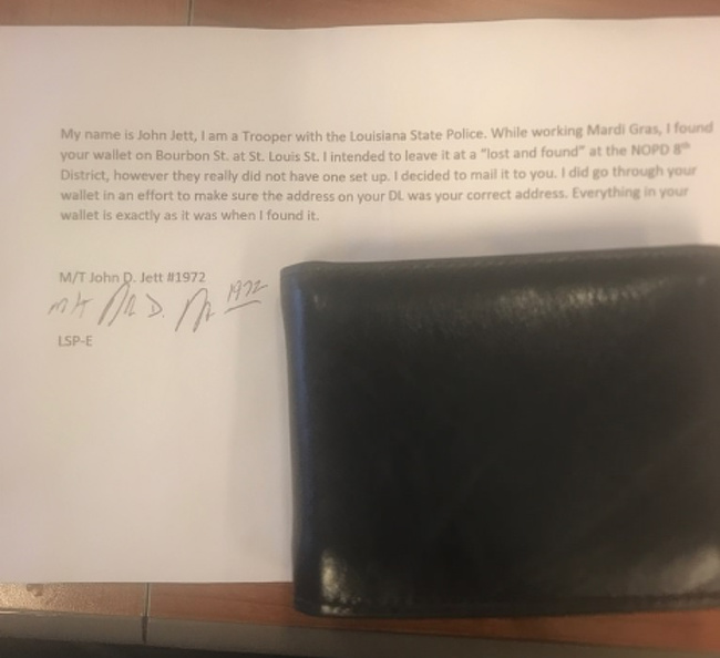 «Мене звуть Джон Джетт, я поліцейський з державної поліції штату Луїзіана. Під час роботи на Марді Грасс я знайшов ваш гаманець на Бурбон-стріт поруч з вулицею Сент-Луїс. Спочатку я хотів залишити його в бюро знахідок відділу поліції 8-го району, але він не працював. І тоді я вирішив відправити гаманець поштою. Я подивився на адресу ваших документах. Все в гаманці залишилося так, як було, коли я його знайшов».