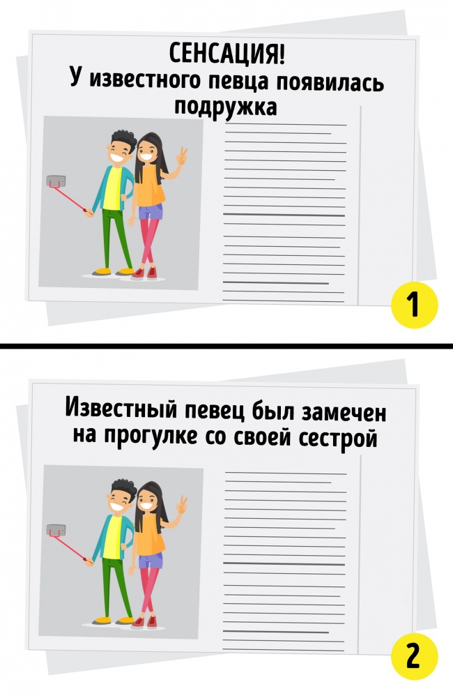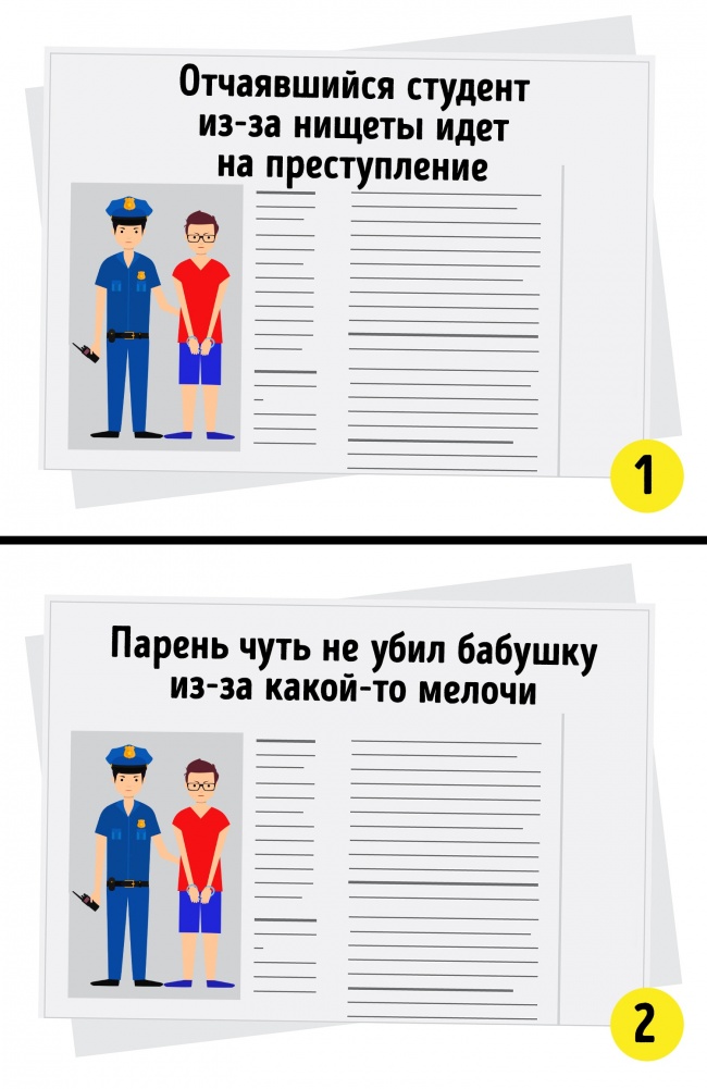 Порівняйте два заголовка однієї і тієї ж новини: «Зневірений студент із-за убогості йде на злочин» і «Мерзотник обікрав пенсіонерку і погрожував їй розправою». Погодьтеся, ці приклади формують різне ставлення до злочинця. У першому випадку його хочеться пожаліти, а в другому — покарати. Читач, не знаючи реальних обставин і фактів, не може тверезо розсудити про новини, тому приймає точку зору журналіста.