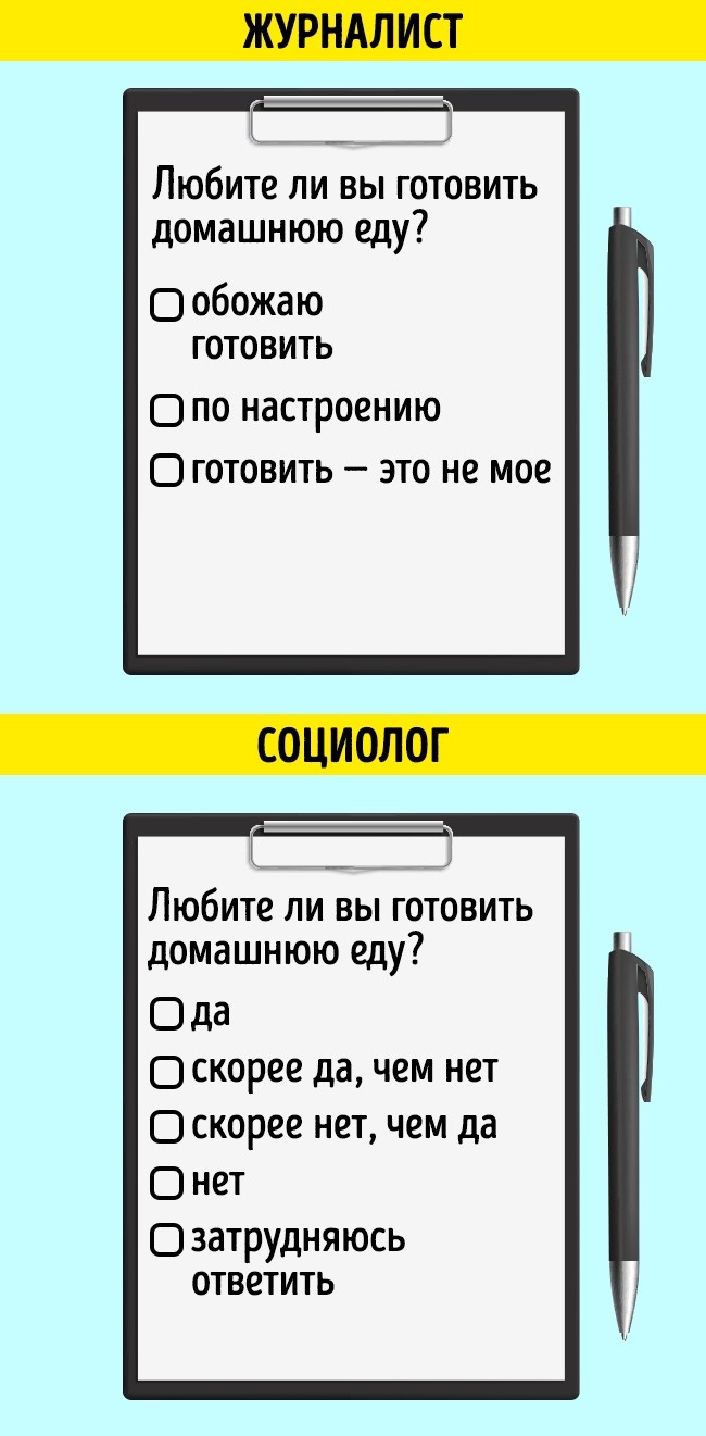 - Неправильно ставлять запитання. Щоб результати опитування можна було вважати об'єктивними, потрібно максимально неупереджено ставити запитання і формулювати передбачувані відповіді. Журналісти часто грішать емоційними формулюваннями і не враховують всю палітру думок, чим обмежують відповіді опитуваних або підштовхують їх до певної відповіді.