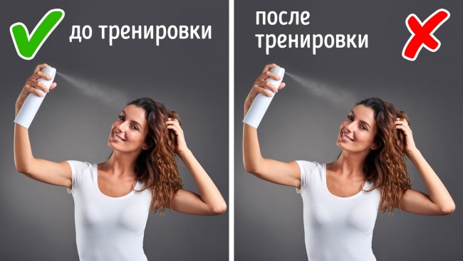 Використовувати сухий шампунь після спортзалу майже марно: після тренування волосся вже настільки жирні, що він майже нічим не допоможе. Краще нанести трохи спрею перед тим, як відправитися в спортзал, так він допоможе поглинути піт під час тренування.