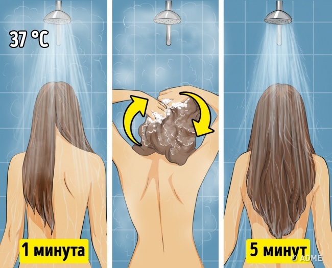 1. Вода повинна бути комфортної температури. Постійте під душем з хвилину і переконайтеся, що волосся повністю намочені.