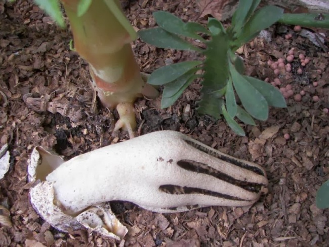 Ще одна назва — Антурус Арчера. Антурус виростає у вигляді яйцевидної цибулини, а коли вона лопається, з'являються білі пальці, схожі на руку мерця, що вилазить з могили. Зрештою «пальці» підіймаються вгору, виростаючи до 10 см у висоту. У зрілій формі у гриба 4-8 червоних «пальців» з чорними колами, що нагадують присоски на щупальцях восьминога.