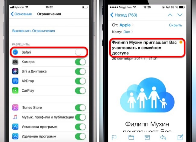 В цілях безпеки своїх дітей батьки можуть обмежити їх доступ на iPhone до певних програм або сайтів. Це робиться в меню «Налаштування» — «Загальні» — «Обмеження» через установку пароля. Інша цікава функція — «Сімейний доступ». Після її включення можна контролювати запити дитини і відхиляти покупку додатка, якщо воно не відповідає батьківським вимогам.