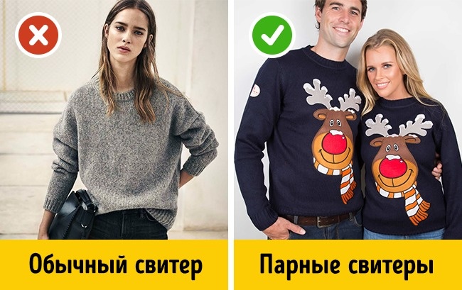 Замість нехай і теплого, але зовсім звичайного светри, виберіть смішний новорічний, наприклад, з мерехтливими вогниками або оленем Рудольфом. Ще краще вийде, якщо ви знайдете парні светри — у них весело зустрічати гостей і грітися біля телевізора.