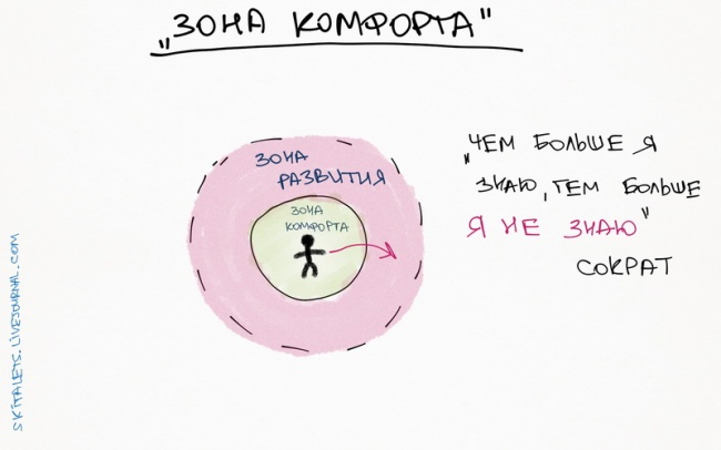 Навчання і розвиток відбуваються через вихід із зони комфорту. У більшості випадків це боляче і неприємно. І чим далі ви рухаєтеся, тим більше дискомфорту в житті виникає, оскільки розширюється зона контакту з невідомим. Те саме, що ще Сократ називав «Я знаю, що нічого не знаю».
