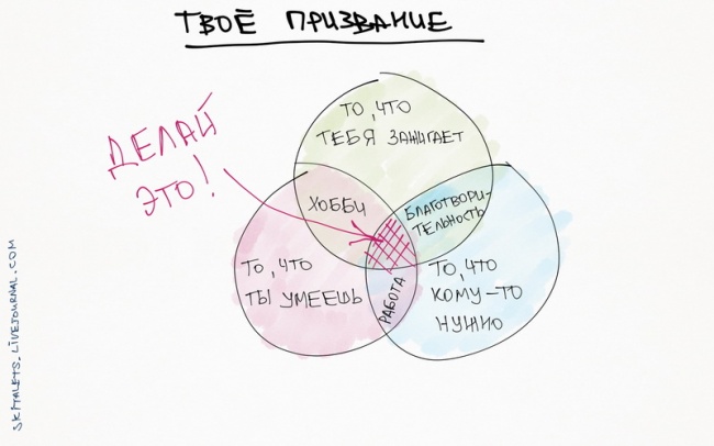 Всі без кінця шукають себе і не можуть знайти, замість того щоб зайнятися хоч якоюсь корисною справою. Адже все дуже просто: покликання знаходиться на стику знань / умінь, пристрасті і потрібності. Значить, треба планомірно працювати над кожним з компонентів. Причому пошук повинен бути діяльним — не через читання книжок, а через куштування та експерименти.