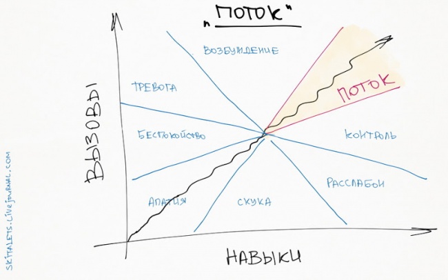 Коли у вас буде достатньо знань і навичок, є шанс зловити «стан потоку», коли працювати буде в кайф. «Потік» — це коли відповідаєш на складні виклики високим професіоналізмом. Тобто ви не зможете його досягти, якщо нічого не вмієте.