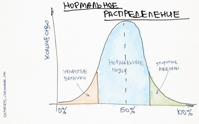 В спілкуванні з людьми і аналізі інформації допомагає розуміння принципу нормального розподілу. Уявляйте собі цю картинку, коли стикаєтеся з будь-якими крайнощами. Як відомо, в природі не буває поділу на чорне і біле — завжди є дуже велика середина і дуже нечисленні «кінці». Але в цих «кінцях» часто ховаються дуже цікаві речі.