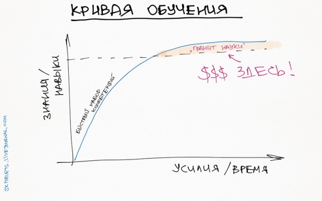 Навчання — процес нелінійний. Спочатку він проходить дуже швидко, потім уповільнюється. Але вся сіль і всі гроші знаходяться там, в цьому довгому «хвості», куди не кожен добирається. Чим краще ви розумієте тему, тим більше конкурентну перевагу перед тими, які зупинилися на півдорозі.