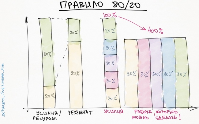 Щоб встигати більше, допомагає вже відоме багатьом правило «80/20»: ми витрачаємо 20% зусиль для досягнення 80% результату. Якщо слідувати йому в розумних межах, то можна за 100% часу зробити в 5 разів більше, ніж інші.