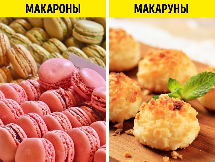 Макарони — це французькі сендвіч-печива з вершковою начинкою та різними смаками. Макаруни, в свою чергу, готуються з тертого кокоса і не містять начинку.