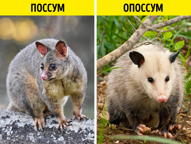 Поссумов і опосум відносяться до різних груп тварин. Опосуми в основному мешкають в Північній Америці, і їх можна дізнатися за білим головах і сіруватим тіл. Поссуми ж живуть в Австралії, мають майже однотонне забарвлення, а їх голова дещо менше, ніж у опосумів.