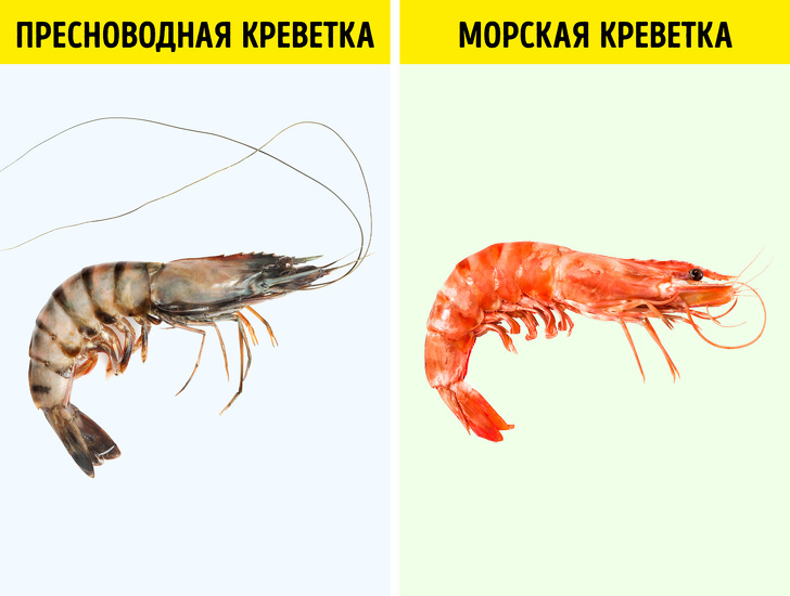 Прісноводні креветки зазвичай крупніше своїх морських родичів, до того ж відрізняються від них анатомічно. У прісноводних креветок клешні розташовуються на 6 ногах, в той час як морські обзавелися клешнями тільки на 4. І, як випливає з назви, ці тварини пристосувалися жити в абсолютно різних водних умовах.