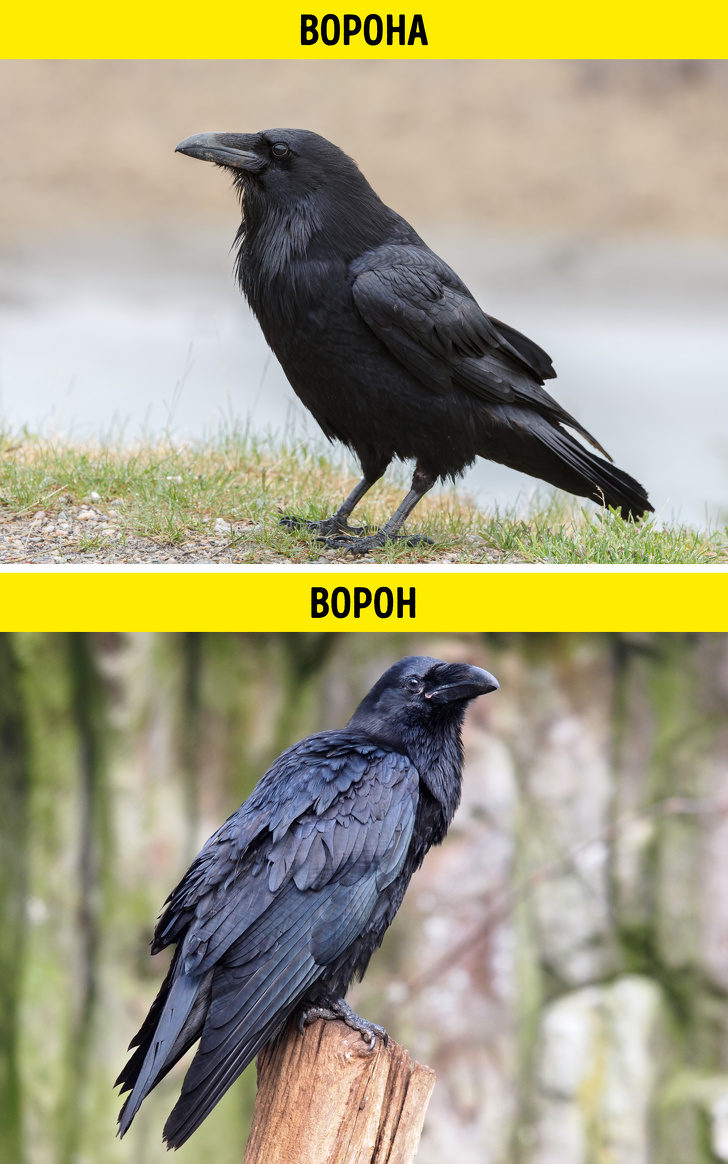 Ворони зазвичай крупніше і воліють подорожувати парами. Ворони більш соціальні, і їх найчастіше можна побачити у великих зграях. Звуки, які видають ці птахи теж різні. Ворони виробляють більш звичні нам каркающие звуки, у той час як голос воронов почасти нагадує квакання.