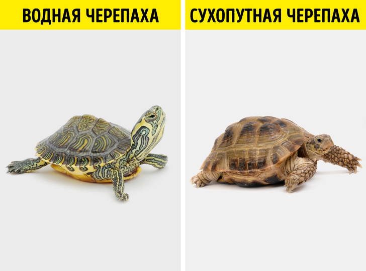 Морські і сухопутні черепахи на перший погляд схожі, але їх життєві звички сильно розрізняються. Морські воліють воду, але можуть жити як на суші, так і у воді. Сухопутні переміщуються активніше морських, воліють рослинну їжу і слабо пристосовані до плавання.