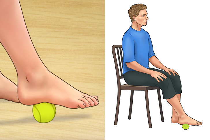 - Сядьте на стілець. Тримайте спину прямо. Покладіть під ногу тенісний м'яч.