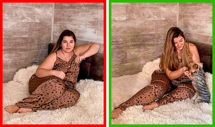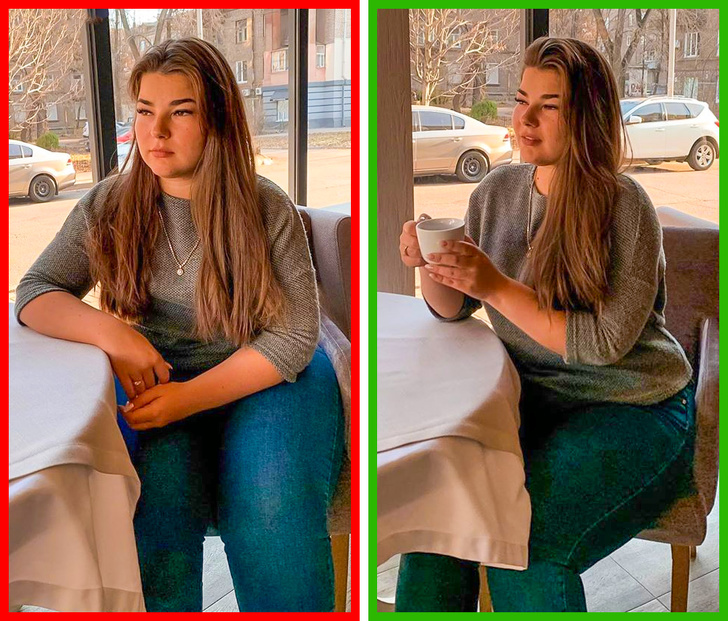 - Якщо не знаєте, куди подіти руки, і хочете, щоб вони виглядали більш гармонійно, додайте який-небудь об'єкт, з яким можна взаємодіяти: тварина, чашку кави, подушку.