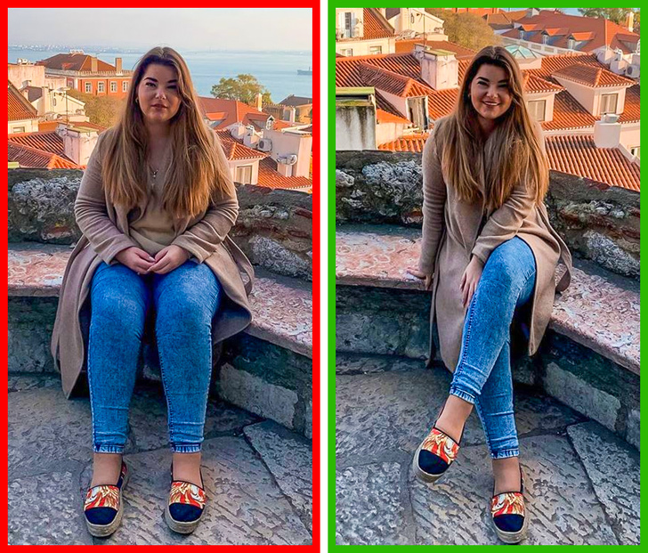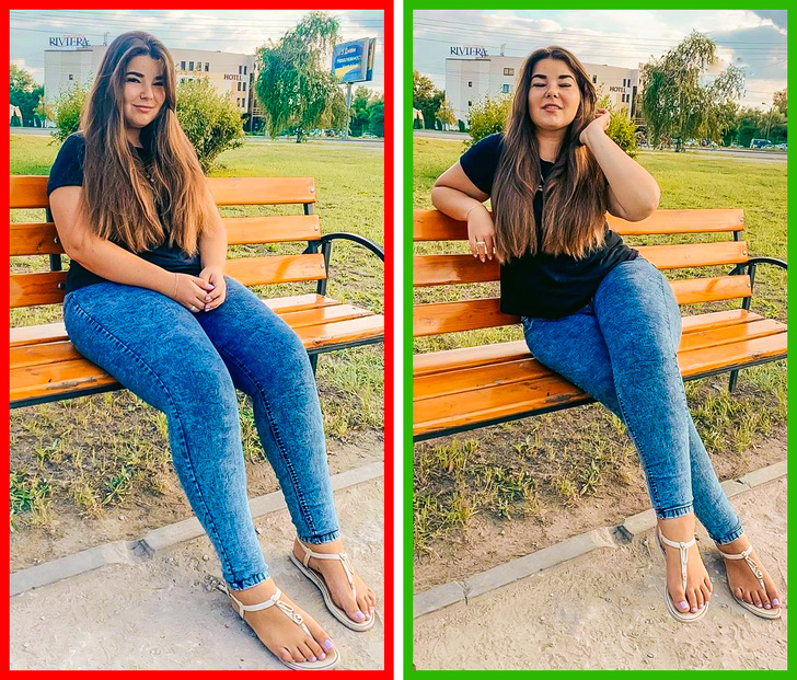 - Сидіти, спершись спиною на лавку, крісло і т. д. Відразу стегна розпливаються, нижня частина збільшується. Все, що ближче до камери, збільшується в розмірах.