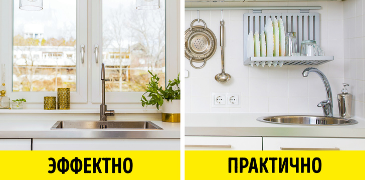 Як правило, над раковиною розміщують сушарку для посуду. Але якщо мийка знаходиться біля вікна, то сушарку тут встановити ніде і доведеться користуватися настільним варіантом, який займе частину стільниці.