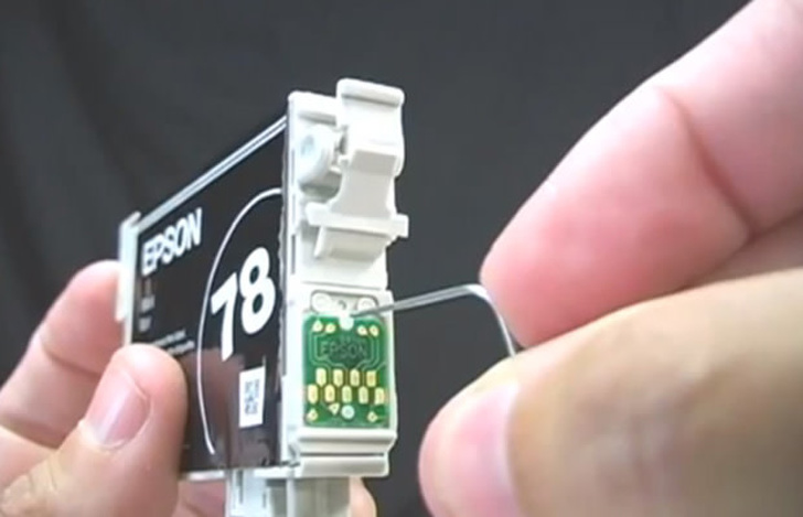 Коли комп'ютер починає сигналізувати про те, що чорнило в картриджі закінчилися, вийміть його з принтера і з допомогою скріпки натисніть кнопку, яка знаходиться близько контактів. Тепер встановіть картридж назад. Комп'ютер заново проведе діагностику, і ви зможете друкувати далі.