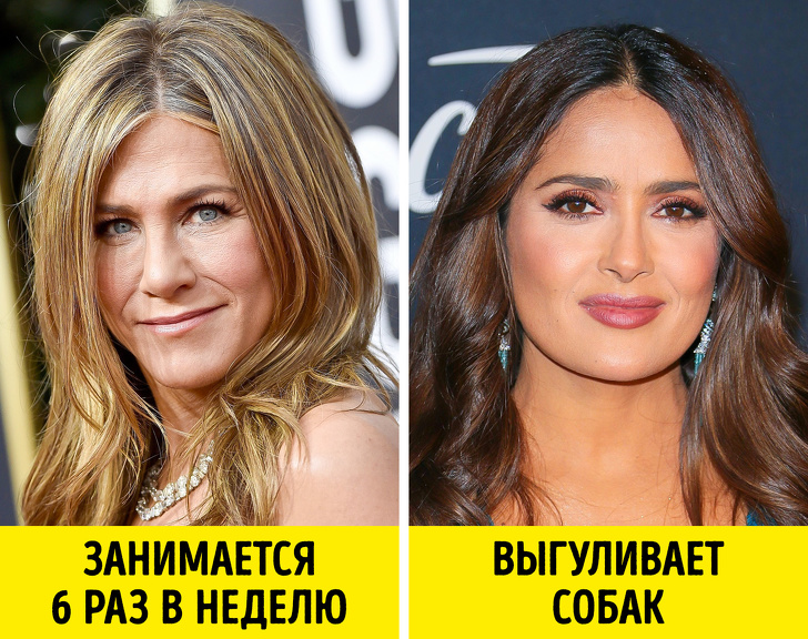 Дженніфер Еністон 50 років, вона тренується 6 разів на тиждень по 1 годині. Сальму Хайєк 53 роки, і вона займається спортом в тому випадку, якщо з'являється вільний час. Але основний вид фітнесу для неї — це вигул собак.