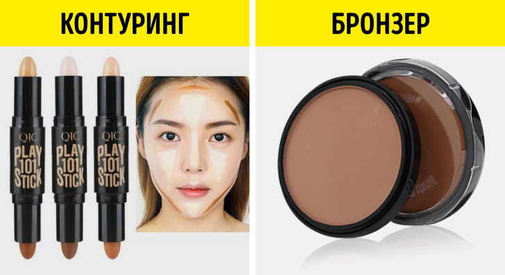 Вони можуть здаватися схожими, але це абсолютно різні речі. З допомогою контуринга ми виділяємо вилиці, робимо корекцію носа. З-за незнання всіх нюансів контурного макіяжу дівчата стали для цих цілей застосовувати бронзери. Але він має досить теплі тони, а в техніці контуринга застосовуються тільки холодні відтінки. Бронзер здатний створити видимість засмаглої шкіри, але створювати правильні тіні їм не потрібно.