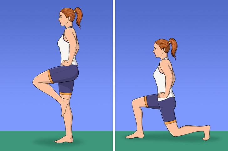 - Випади. Підніміть ліве коліно вгору, а потім повільно опуститеся і упріться носком у підлогу. Повторюйте такі випади назад протягом 1 хвилини на кожну ногу. Зробіть 3 підходи.
