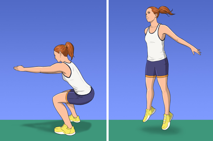- Стрибок-присідання. Поставте ноги ширше стегон, пальці дивляться назовні. Спину тримайте рівно і зробіть присідання так, щоб таз виявився нижче рівня колін. Перенесіть вагу на п'яти, а потім зробіть стрибок вгору. Для того щоб вистрибнути на максимальний рівень, допомагайте собі руками. Повторюйте вправу протягом 30 секунд, відпочиньте і виконайте ще 2 підходи.