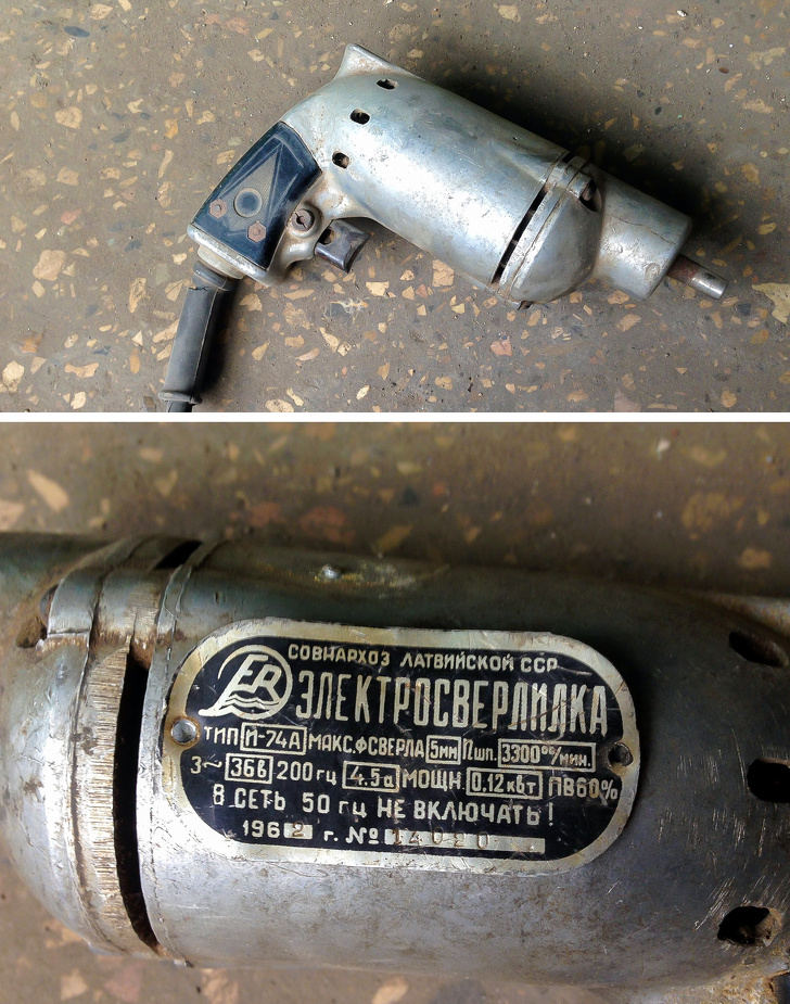 Латвійська электросверлилка 1962 року чекала своєї години в надрах ремонтованого приміщення. Автор фотографії випробувати її не ризикнув